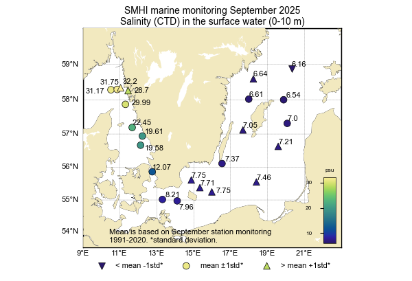 Ytvattentemperaturen låg runt 15–17 °C i Skagerrak, 15–16 °C i Kattegatt och Öresund samt 13–17 °C i Östersjön. Salthalten i ytvattnet var 29–32 psu i Skagerrak, 20–23 i Kattegatt, 12 psu i Öresund och 6–8 i Egentliga Östersjön.