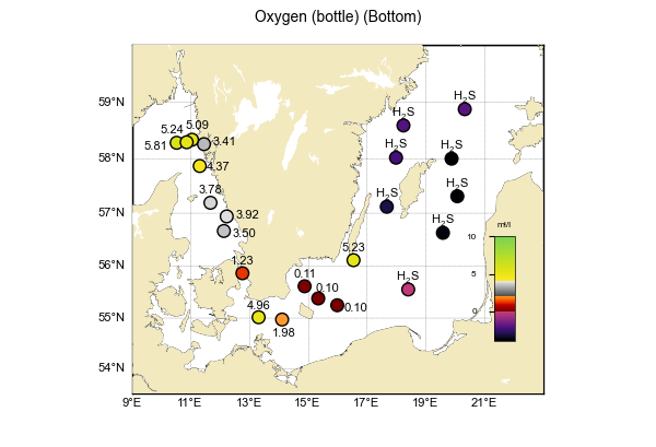 Syrenivåerna i bottenvattnet i Västerhavet var goda (3,4–5,8 ml/l). I Arkonabassängen har syrenivåerna ökat sedan augusti, med halter precis på gränsen för akut syrebrist (2,0 ml/l) vid station BY2, men väl över vid station BY1. Det tyder på att det sedan augusti har skett ett inflöde av syrerikt bottenvatten genom Öresund in i Arkonabassängen. I Bornholmsbassängen råder fortfarande akut syrebrist från 70–80 meter, även i Hanöbukten där syrehalten har minskat sedan i augusti. I Gotlandsbassängen observerades akut syrebrist redan från 70–80 meter, och svavelväte påträffades någonstans mellan 80–90 m i nordöstra delen och 140–150 m i sydvästra delen. I Västra Gotlandsbassängen råder akut syrebrist från 70 m och svavelväte förekom från 80 meter.