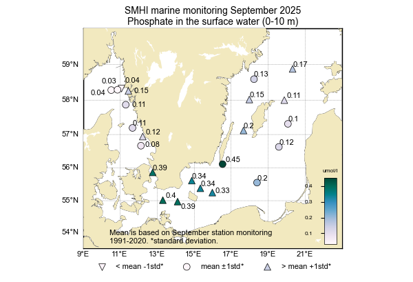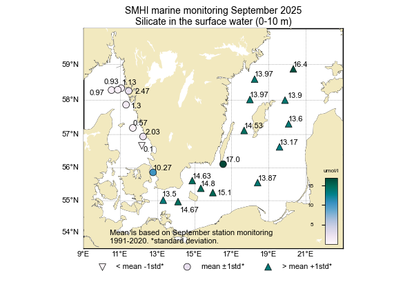 Fosfatkoncentrationerna var över det normala för månaden i större delen av egentliga Östersjön, med halter omkring 0,1–0,4 µmol/l i ytan. Koncentrationen av silikat i ytvattnet var över det normala vid alla stationer utom vid Ölands Södra udde, med uppmätta halter mellan 13–17 µmol/l.