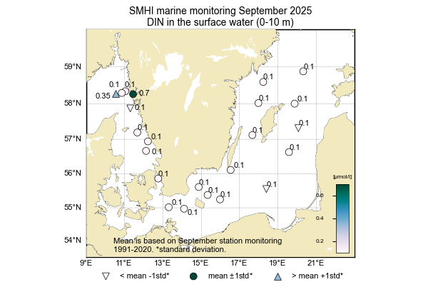 Koncentrationen av DIN i ytvattnet låg under eller nära detektionsgränsen (0,1 µmol/l), med några värden som var lägre än normalt för månaden i Östra Gotlandsbassängen.