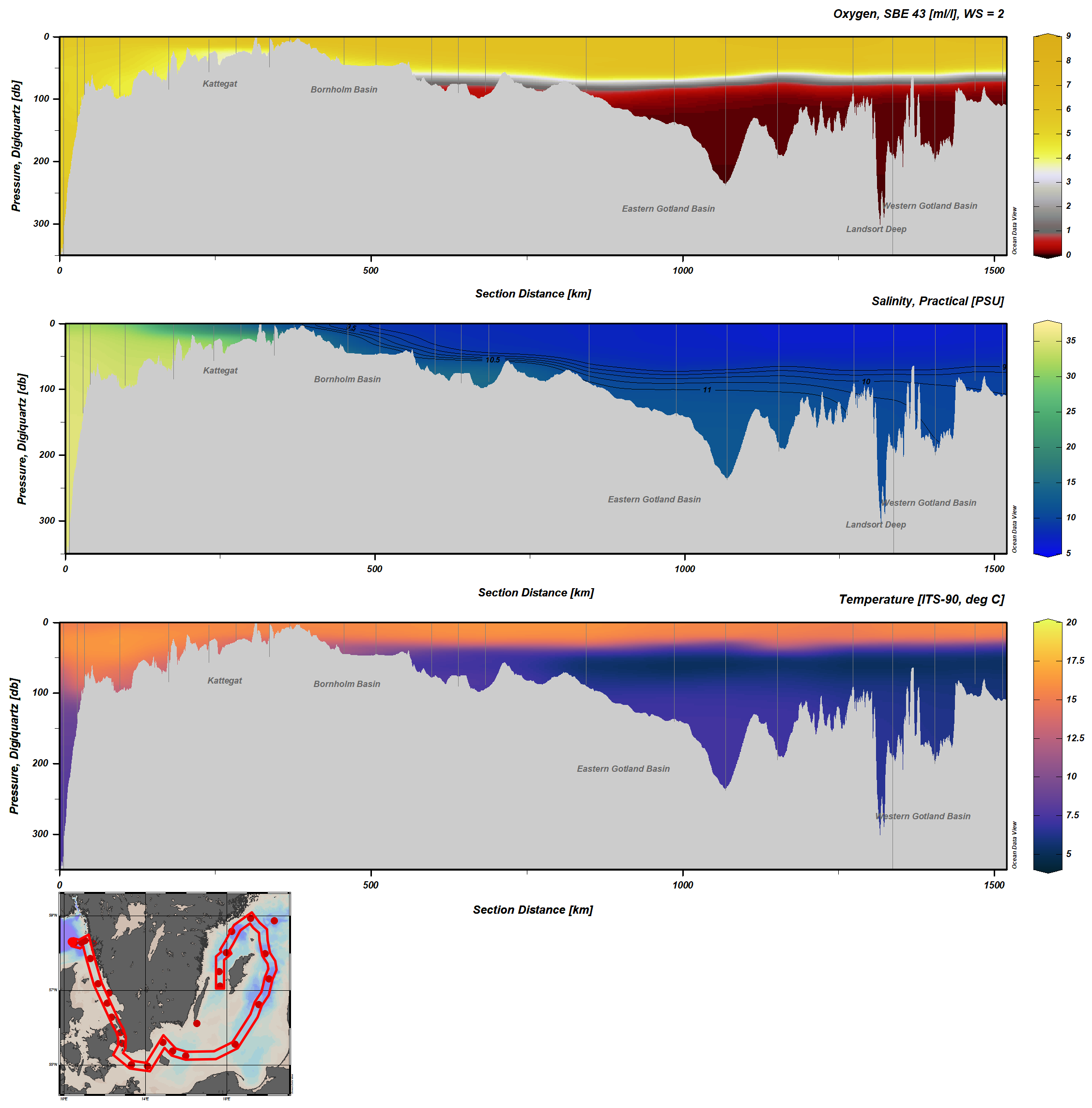 Förstora bildenFigur: Snitt som visar syrekoncentration, salthalt och temperatur från mätningar med CTD och MVP, från Skagerrak till Östra Gotlandsbassängen och vidare in i Västra Gotlandsbassängen.