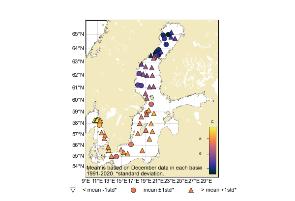 Avkylningen av ytvattnet fortsatte i december men ytvattentemperaturen var över normal vid de allra flesta stationer i samtliga havsområden. Temperaturen i ytvattnet var 8–9 grader i Västerhavet, 7–8 grader i Egentliga Östersjön och 5–6 grader i Bottniska viken.