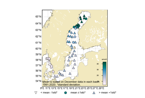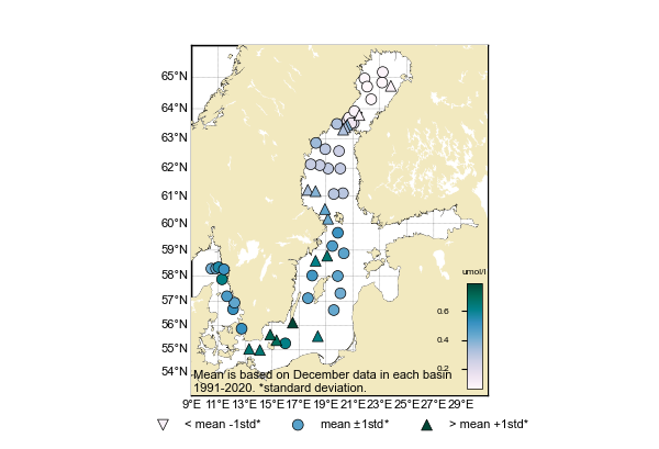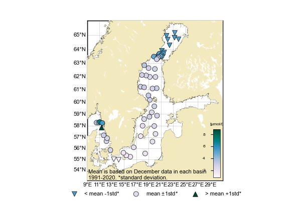Koncentrationerna av fosfat och löst oorganiskt kväve (DIN) hade ökat vid samtliga stationer sedan senaste mätningen (oktober eller november). På några stationer var koncentrationen av fosfat i det välblandade lagret över det normala, med koncentrationer mellan 0,6–0,7 μmol/l, medan koncentrationerna vid övriga stationer låg runt 0,4–0,5 μmol/l. De lägre koncentrationerna uppmättes i Bornholmsbassägen, Arkonabassängen, stationen BCS III-10 och i Landsortsdjupet. Koncentrationen av silikat var över normal och varierade mellan 15–19 μmol/l.