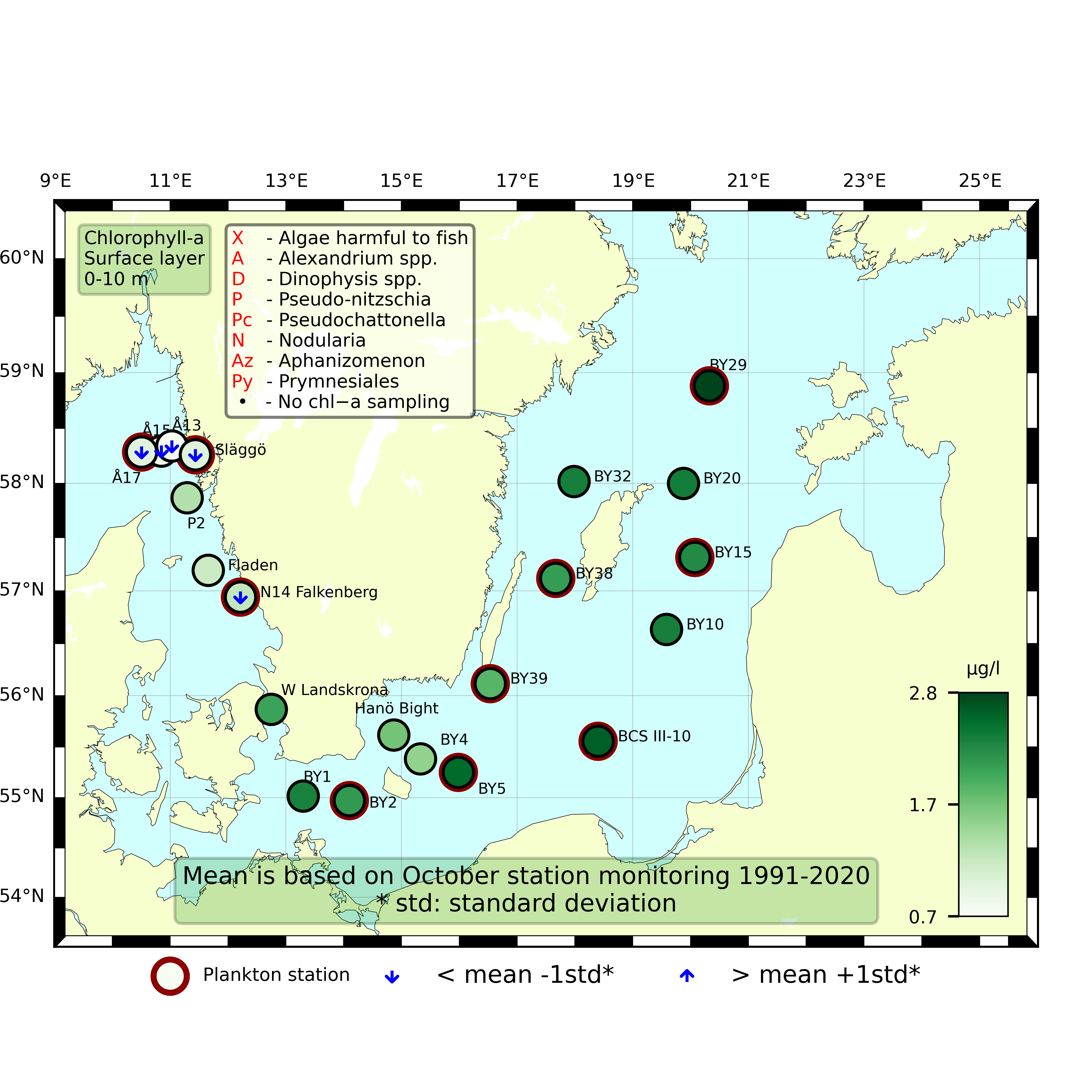 Kartan visare resultat från de senaste mätningarna. Färgen anger hur mycket klorofyll a det finns i de översta 10 metrarna. Mörkgrön betyder mer klorofyll och ljusgrön betyder mindre. Blå pil upp eller ned i cirklarna visar om senaste mätningarna är över eller under en standardavvikelse från ett referensmedelvärde. Referensmedelvärdet är beräknat utifrån aktuell månad under perioden 2001-2015. Växtplankton provtas vid de stationer som markeras med röd cirkel. Om det finns några skadliga alger vid de stationerna markeras det med symbol.
